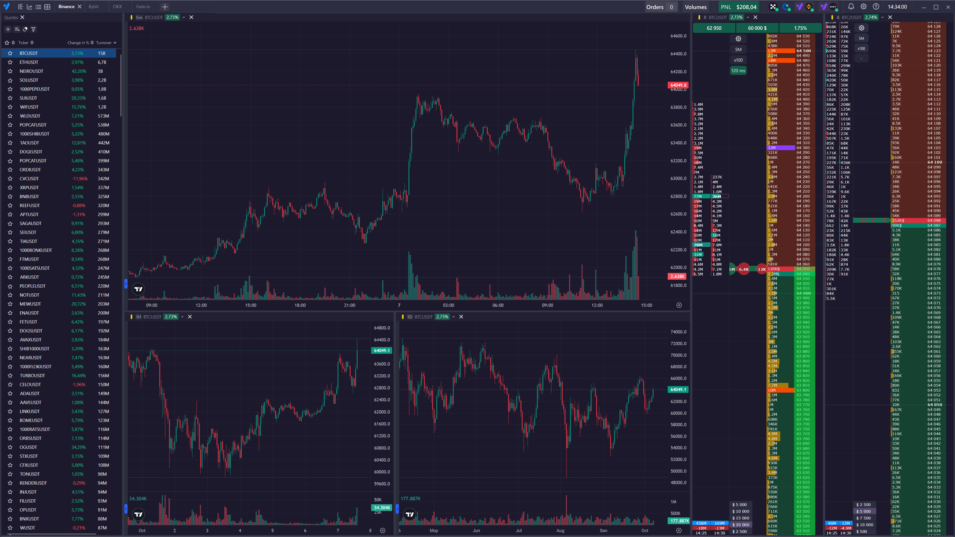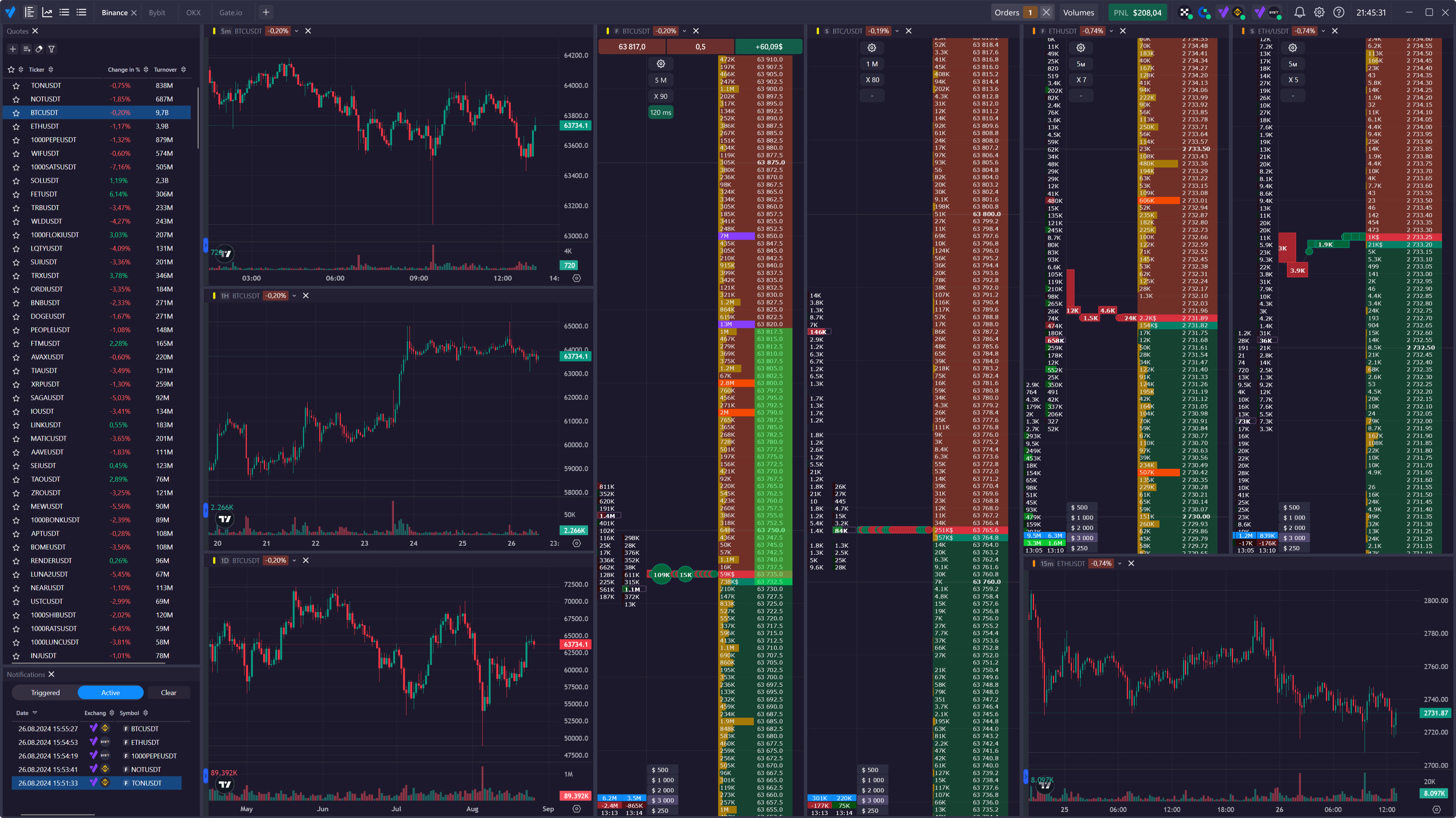 Create windows and tabs, group order books, charts and quotes from different exchanges on several monitors