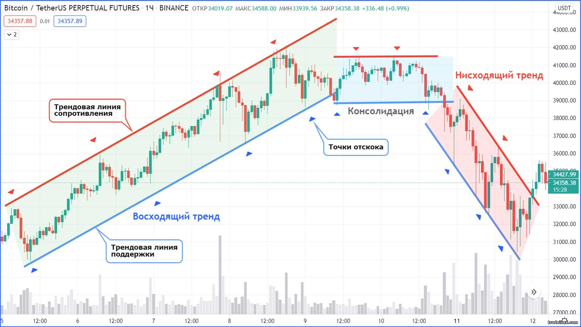 Нисходящий тренд, или даунтренд — противоположная ситуация: последовательность понижающихся максимумов (LH — Lower Highs) и минимумов (LL — Lower Lows). Это сигнал об однозначном доминировании продавцов. Каждый откат вверх (коррекция) заканчивается ниже предыдущего максимума, а каждое последующее движение вниз устанавливает новый минимум. Аналогично, это идеальный сценарий, в котором рынок однозначно заявляет о направлении “только вниз”.