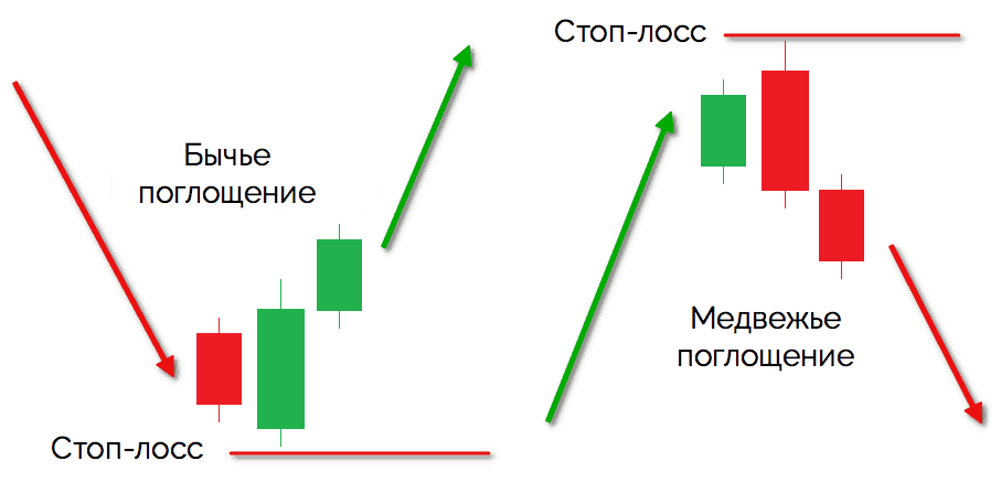 Такое поведение часто говорит о завершении коррекции или о том, что текущий импульс начинает “рассыпаться”. В чистом виде поглощение редко используют как сигнал в вакууме, но в контексте уровня или экстремума оно даёт важную информацию о том, кто именно перехватывает рынок.