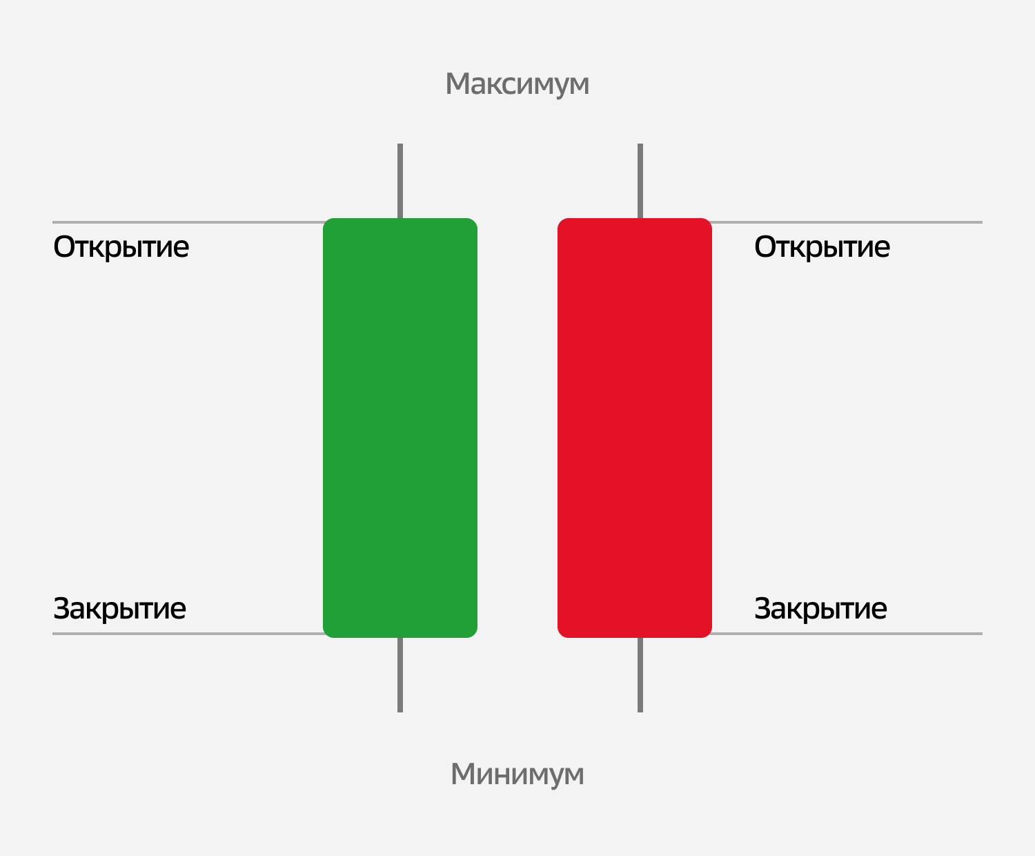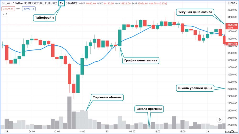 Каждая свеча на графике — это миниатюрная история борьбы между покупателями и продавцами. Свеча отражает фактическое движение цены за выбранный отрезок времени. То есть, 1m свеча показывает, как цена двигалась за минуту, свеча 1H — за час, 1D — за торговый день или сутки, и так далее. В свече заложены 4 основных вводных: OHLC, или цена открытия, минимальная цена, максимальная цена и цена закрытия за выбранный таймфрейм.