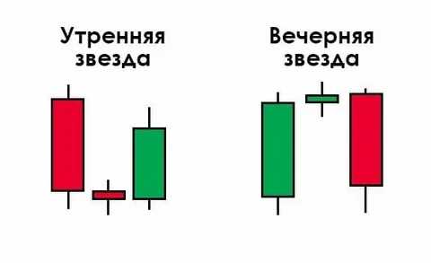 - Утренняя и вечерняя звезда — трёхсвечные модели, которые хорошо иллюстрируют смену рыночной фазы. Первая свеча продолжает текущее движение, вторая показывает замедление и неопределённость, третья — уже уверенно разворачивает цену в противоположную сторону.