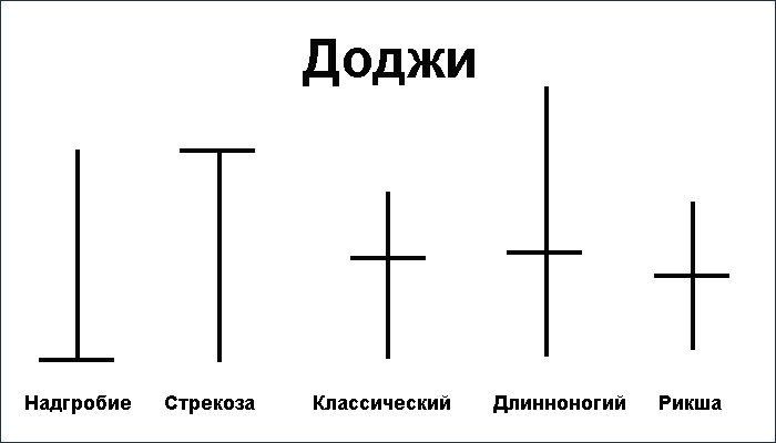 - Доджи — свеча с минимальным телом и примерно равными тенями. Это своеобразный баланс: ни покупатели, ни продавцы не смогли навязать своё решение в рамках выбранного таймфрейма.
